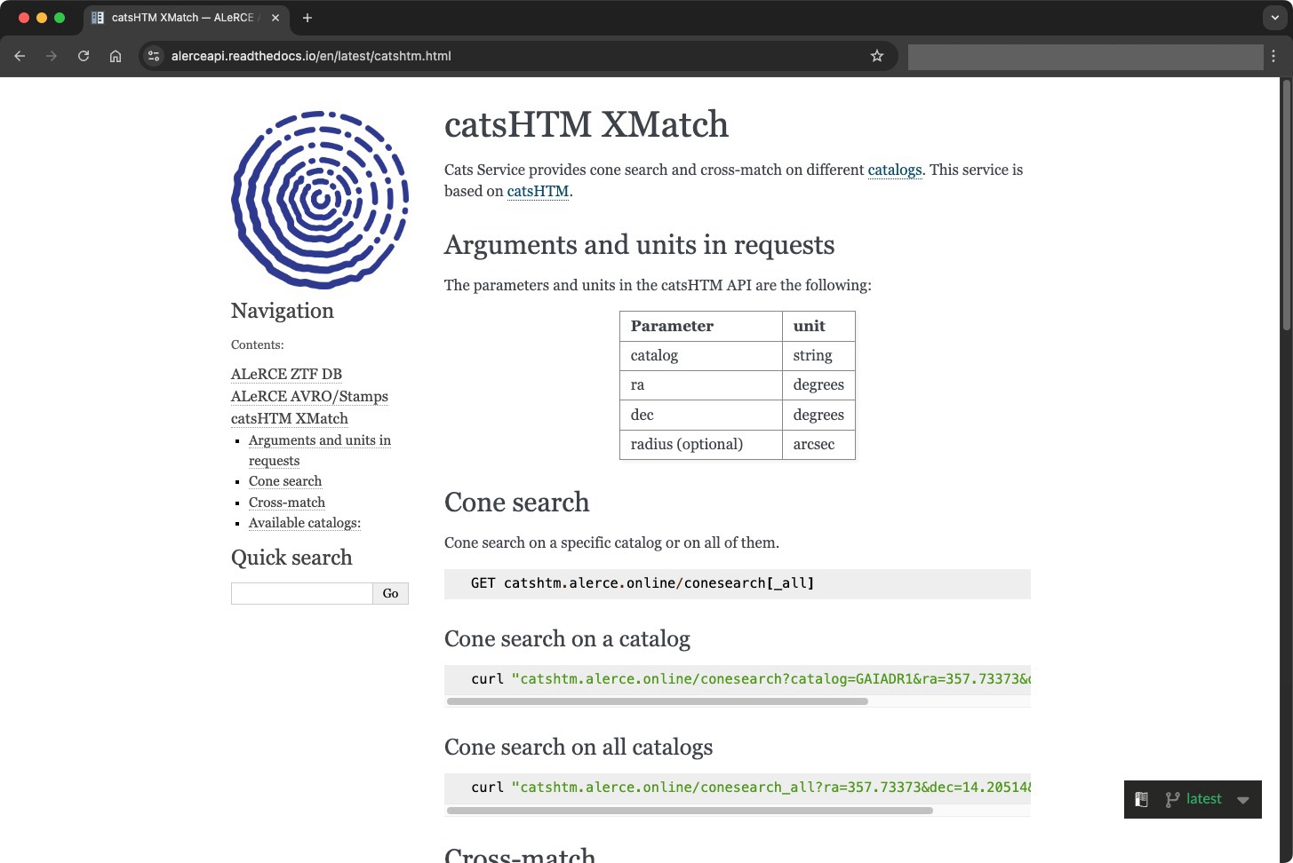 This service allows users to do cone searches to a given location using the catsHTM catalogs. This includes cone searches returning all the objects closer than a given distance from all the catalogs, from a specific catalog, or only the closest object from all or a given catalog. This service is used by the ALeRCE explorer.